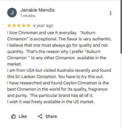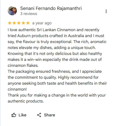 "I love authentic Sri Lankan Cinnamon and recently tried Auburn products crafted in Australia and I must say, the flavour is truly exceptional. The rich, aromatic notes elevate my dishes, adding a unique touch. Knowing that it's not only delicious but also healthy makes it a win-win especially the drink made out of cinnamon flakes.