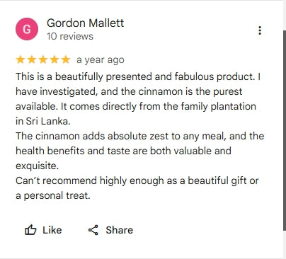 "This is a beautifully presented and fabulous product. I have investigated, and the cinnamon is the purest available. It comes directly from the family plantation in Sri Lanka.